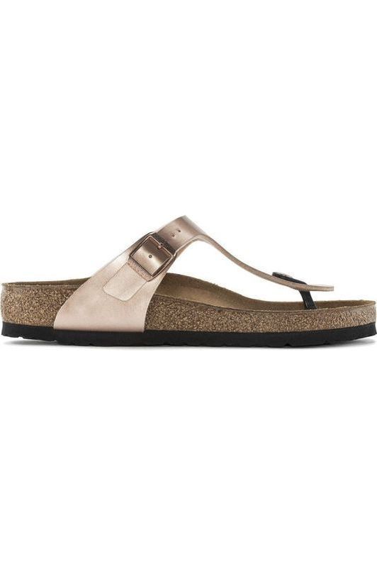 El modelo Gizeh de BIRKENSTOCK es un auténtico clásico que aúna sujeción óptima y diseño minimalista a la moda. El estilo de esta sandalia se ha reinterpretado con un acabado metalizado eléctrico muy original. La lámina espejada otorga un nuevo brillo a este modelo clásico, que da un toque muy especial a cualquier atuendo. El material superior está compuesto por Birko-Flor®, material sintético resistente y respetuoso con la piel.