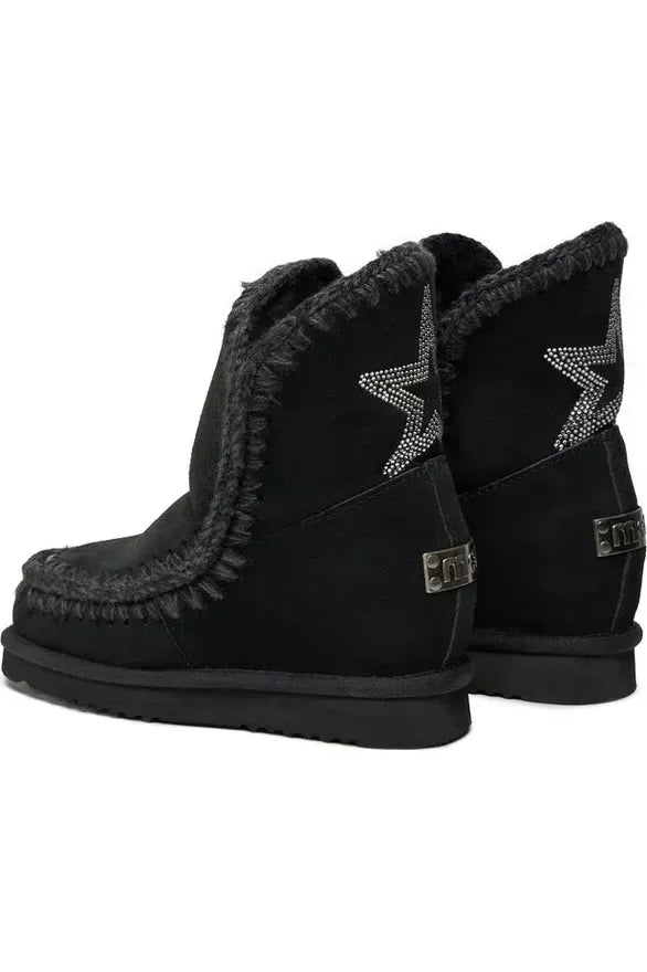 Nuestras eskimo con cuña interior se han actualizado con un parche con forma de estrella en la parte posterior que hace un look divertido. Este modelo combina lo mejor de la marca mou con un tacón oculto de 5 cm y una forma más estilizada. Increíblemente cómodas y favorecedoras, este modelo está elaborado con suave piel genuina de oveja, las características costuras de lana de la marca mou tejidas a mano, un soporte de apoyo para el talón y una resistente suela de EVA. Disponibles con acabados especiales de polvo y cuero metalizados. Altura 23 cm. Regular fit.