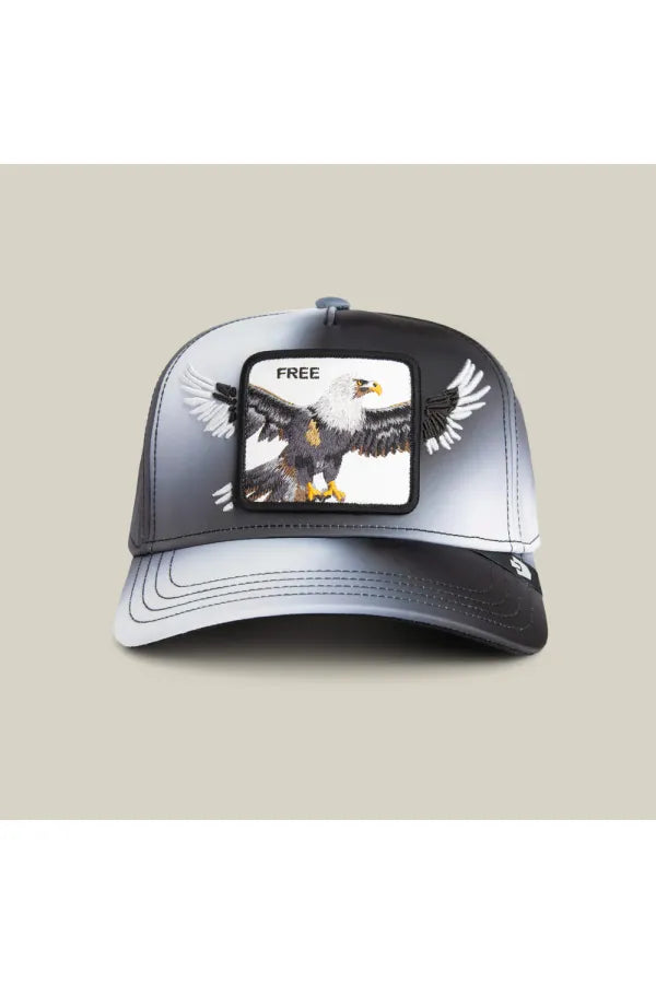 Águila calva liberándose, con un degradado negro y gris como nubes de tormenta a punto de abrirse. El parche dice "Libre", pero cuidado: intentarán quitártelo de la cabeza.