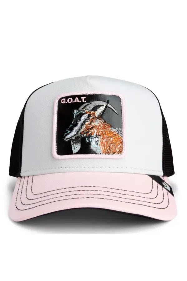 - Parche frontal bordado con la imagen de una cabra y la inscripción “GOAT”.