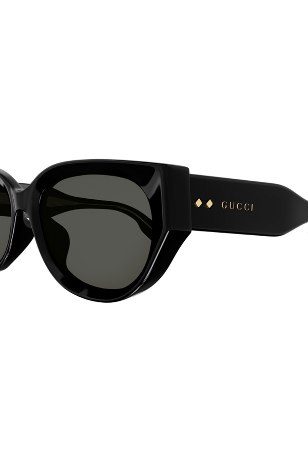 Gafas gruesas y facetadas de acetato que juegan con los volúmenes y las geometrías adornadas con los icónicos remaches. Atrevido diseño 'cat eye' redondo de acetato. Logotipo con las letras dorado grabado en las varillas y realzado con los icónicos remaches Gucci. Paleta de colores pastel femenina para un look de estilo veraniego.