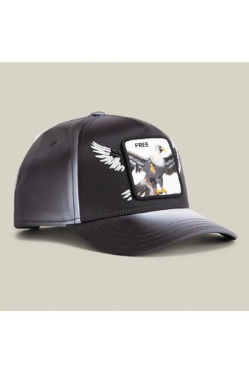 Águila calva liberándose, con un degradado negro y gris como nubes de tormenta a punto de abrirse. El parche dice "Libre", pero cuidado: intentarán quitártelo de la cabeza.