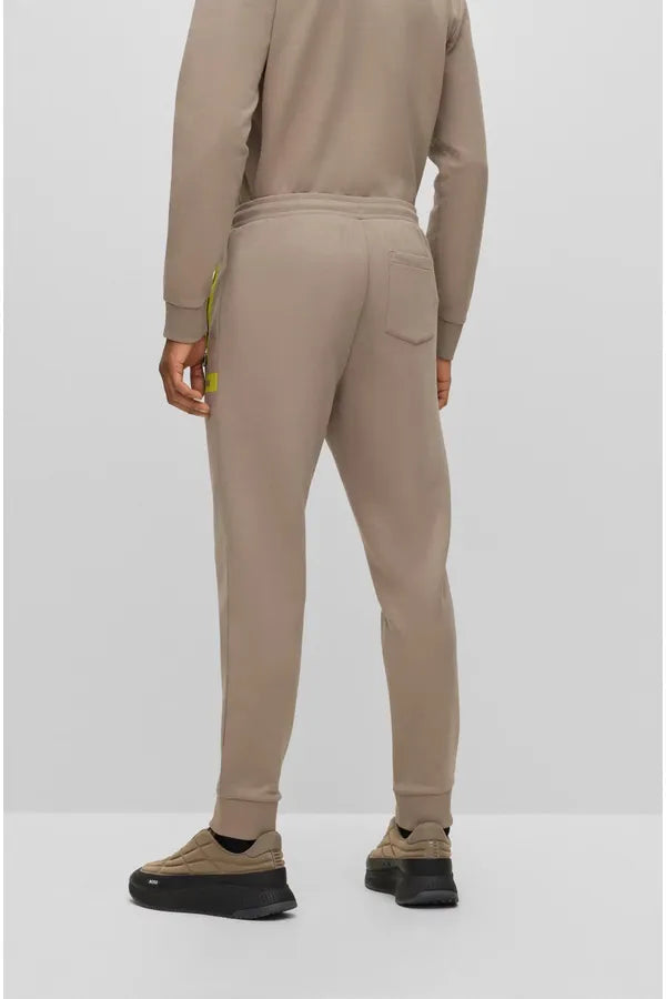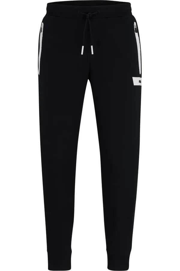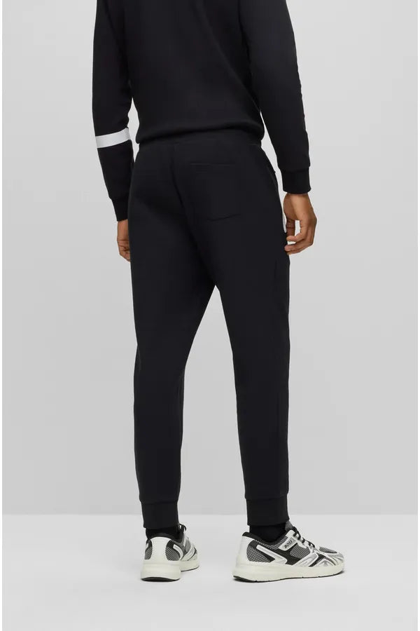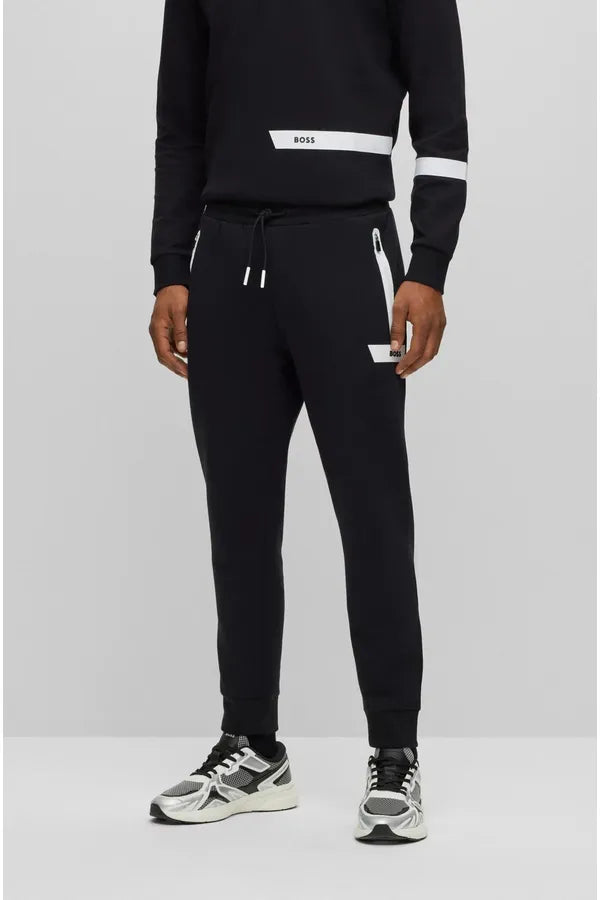 Unos pantalones de chándal regular fit BOSS Hombre en punto elástico con puños, detalles de ribetes pegados en los bolsillos con cremallera y raya gráfica de la marca.