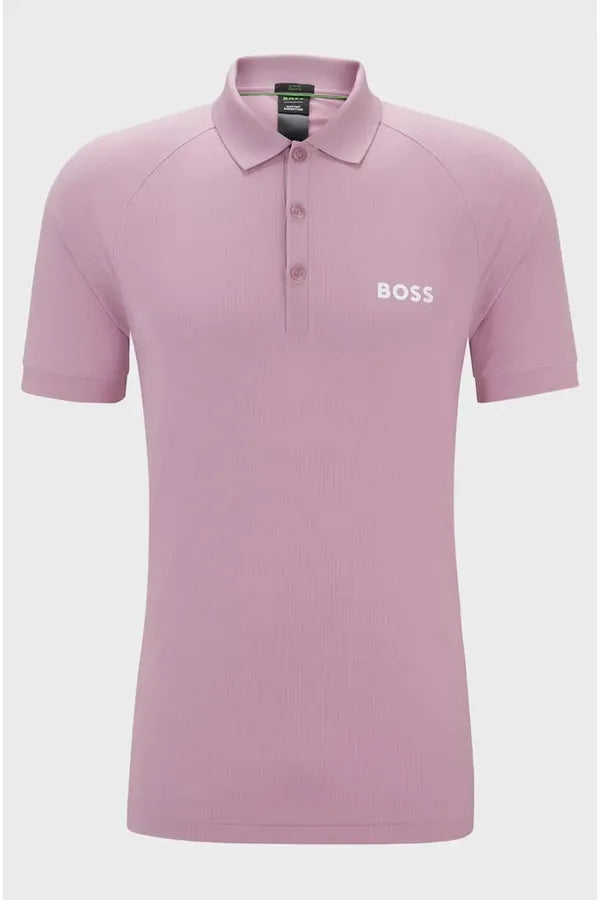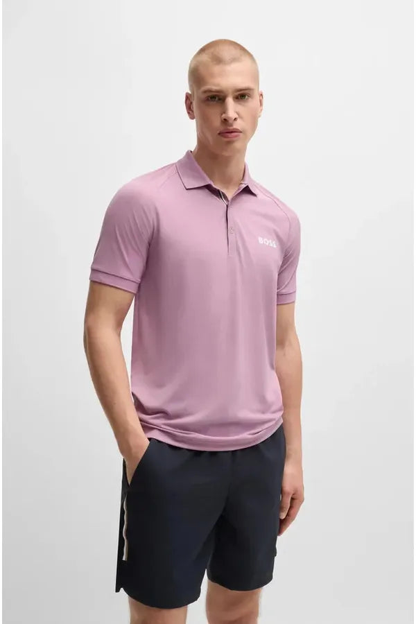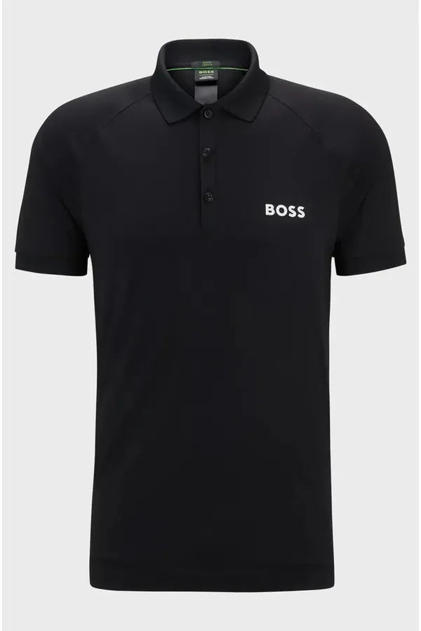 Un polo BOSS slim-fit con logo estampado en contraste. Este top se ha diseñado en tejido de rejilla con protección UV y control de olor. Forma parte de la dinámica colección cápsula BOSS x Matteo Berrettini, creada en colaboración con el tenista profesional italiano.