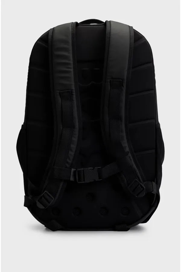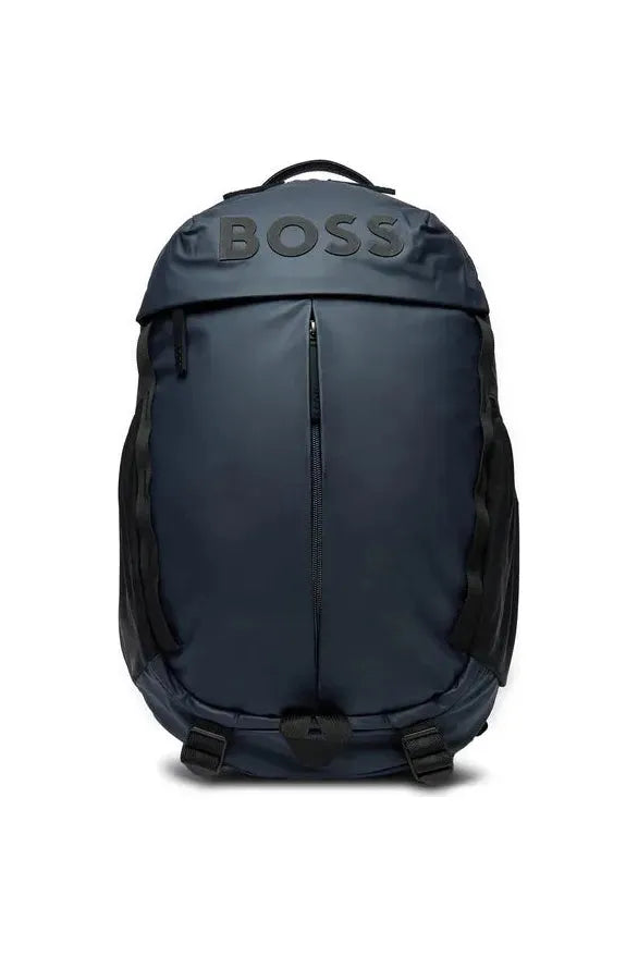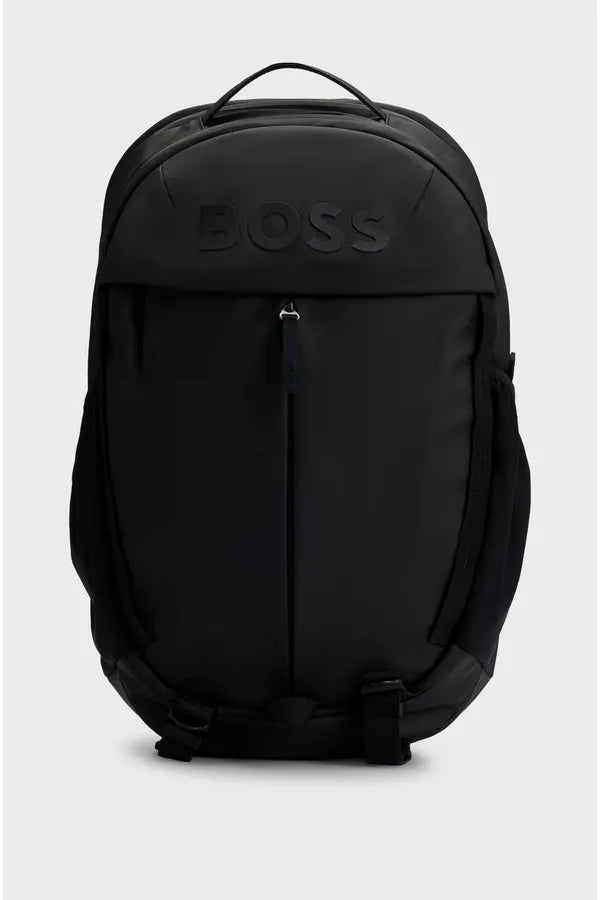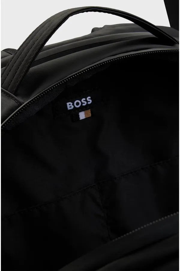 Una mochila BOSS inconfundible, elaborada en tejido sintético revestido con ribetes de la marca y un logo grande en la parte delantera. El tejido sintético revestido, a veces denominado piel sintética, es un tejido diseñado para parecerse a la piel auténtica o mostrar un acabado mate, brillante, liso o con textura. Medidas: 50 x 30,6 x 18 cm