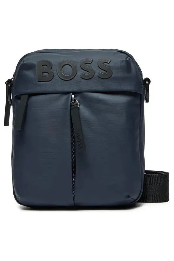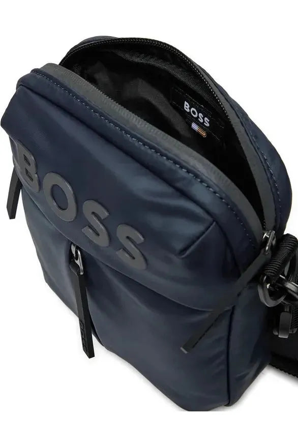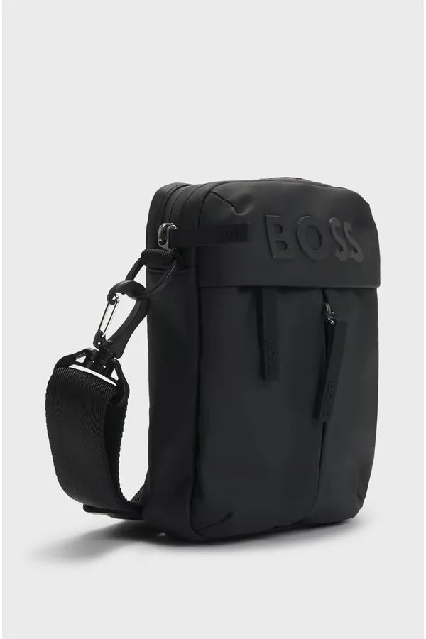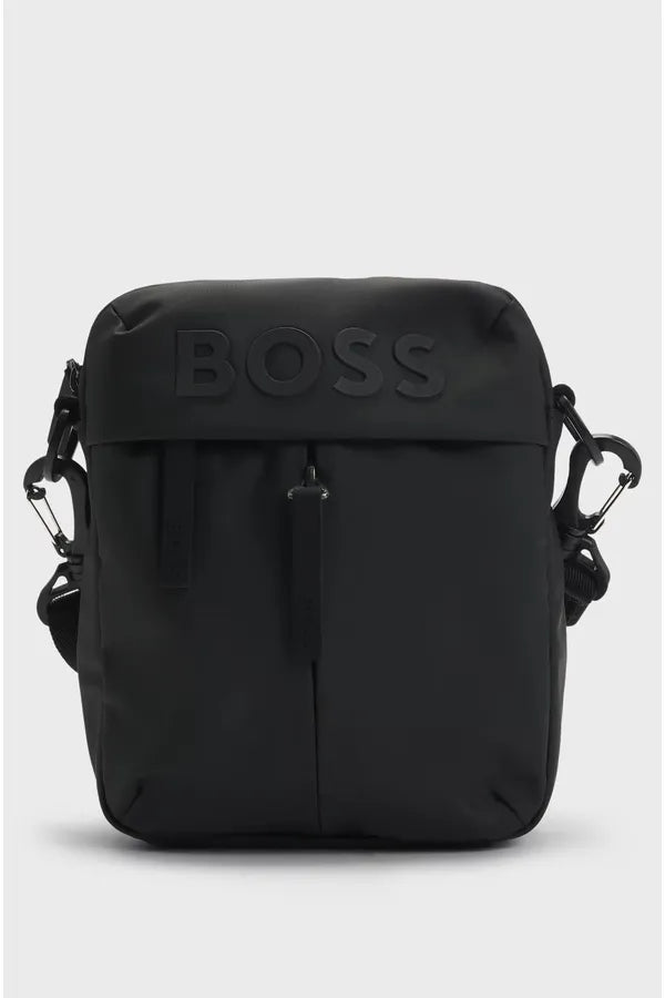 Un bolso mensajero BOSS elaborado en tejido sintético revestido con correa desmontable para el hombro, ribetes de la marca y logo grande. El tejido sintético revestido, a veces denominado piel sintética, es un tejido diseñado para parecerse a la piel auténtica o mostrar un acabado mate, brillante, liso o con textura. Medidas: 16 x 20,5 x 4,5 cm.