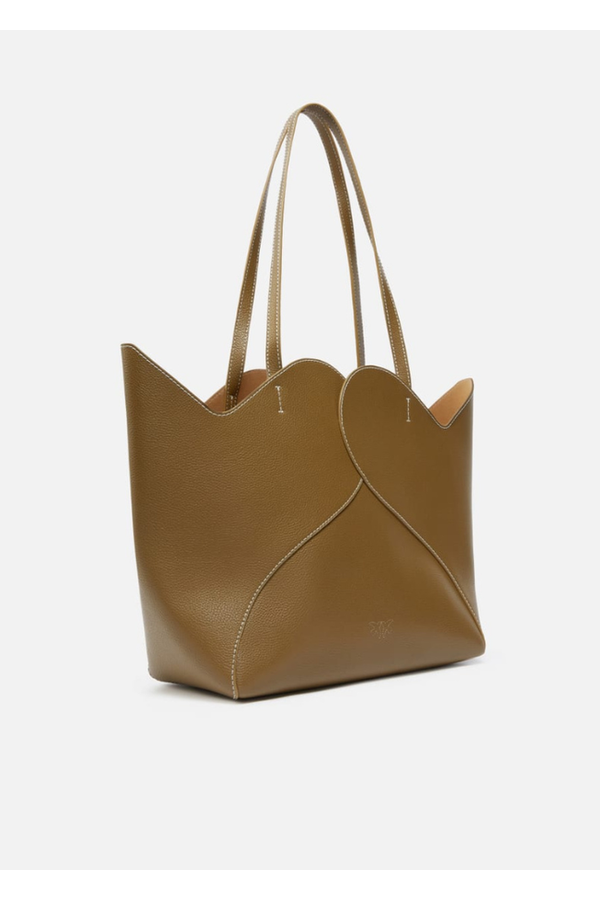 Bolso shopper grande Heart Bag en fina piel de plena flor con una distintiva forma contorneada que recuerda a dos corazones entrelazados. Este bolso de día se completa con una doble asa de piel para llevarlo tanto al hombro como en la mano. Se adorna con una placa con el logotipo Love Birds Diamond Cut de metal.