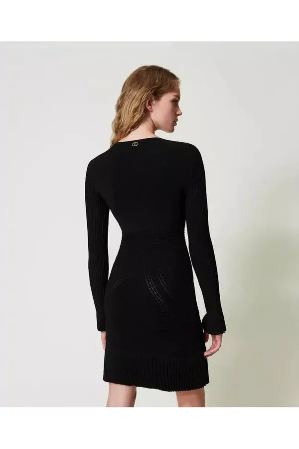 Vestido corto de punto de mezcla de viscosa elástica con confección tubular que crea un juego de puntos y dibuja la silueta. Tiene cuello redondo, mangas largas, bajo ligeramente evasé y corte ceñido. Este vestido es perfecto para una graduación o evento formal.