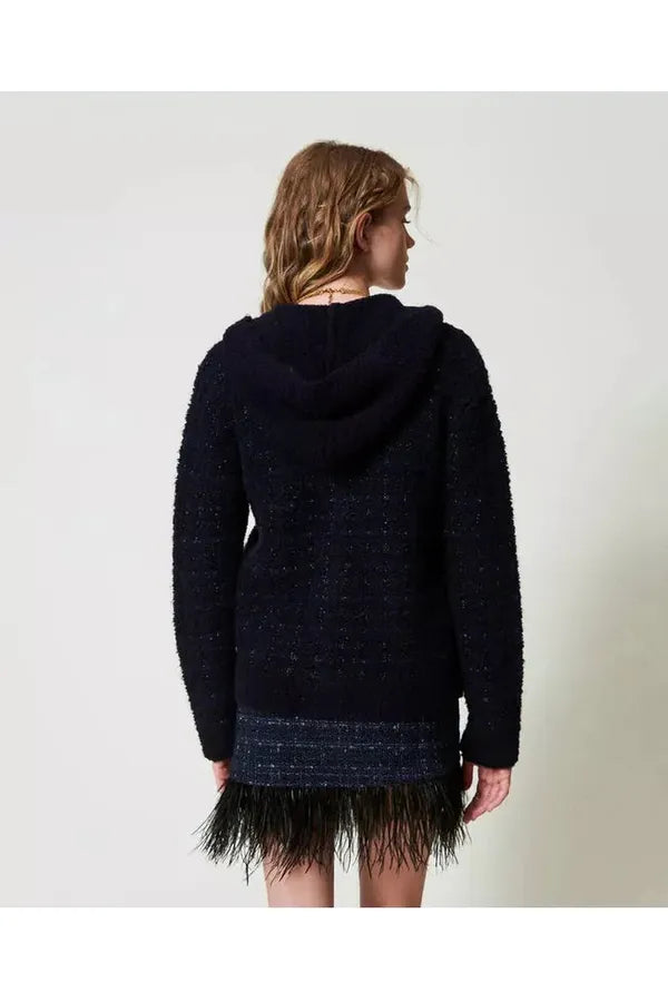 Chaqueta made in Italy de punto con lúrex de confección jacquard con diseño de cuadros. Tiene cuello con capucha, cierre oculto con botones automáticos, mangas largas y corte holgado.