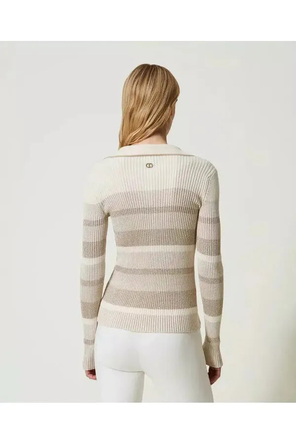 Alegra tu estilo diario con el punto ceñido en hilo de mezcla de viscosa y algodón con lúrex, trabajado en vanizado con una mezcla de rayas sombreadas. Tiene cuello de polo, mangas largas y una placa metálica con el logotipo Oval T en la espalda. Diseño de moda para completar todos tus looks.