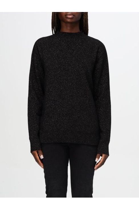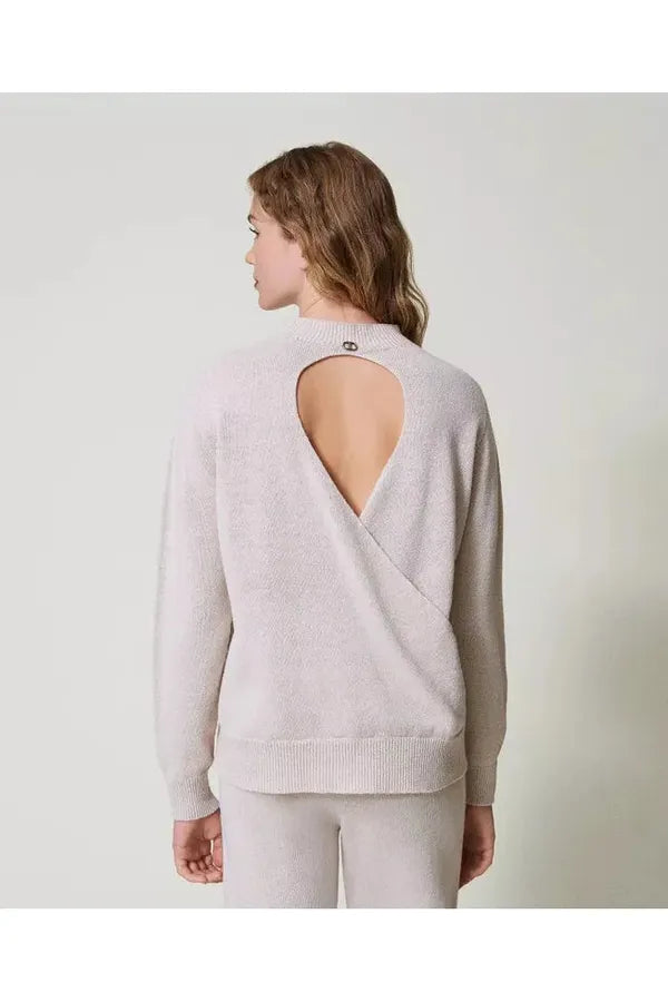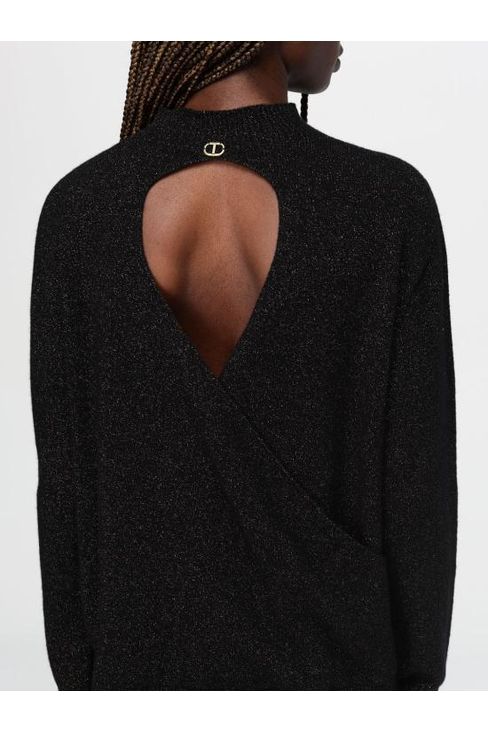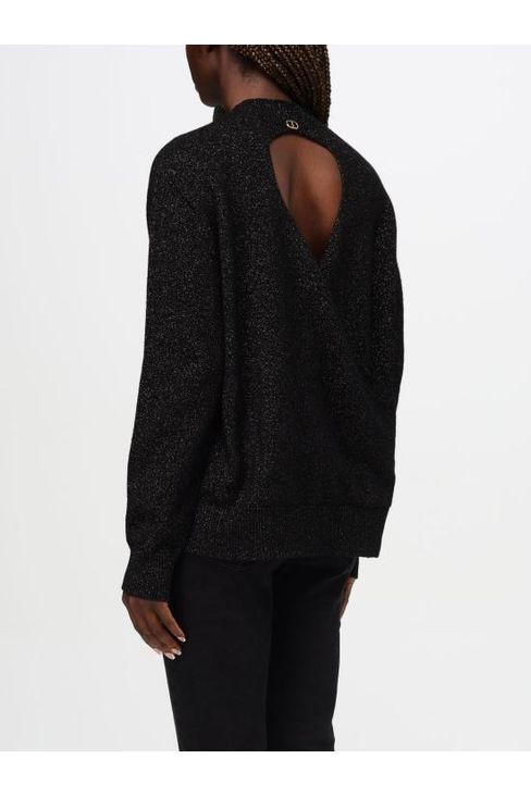 Jersey made in Italy en mezcla de lana y lúrex con cuello alto, cruzado en la parte trasera creando una abertura. Tiene mangas largas, ribetes acanalados y corte holgado.