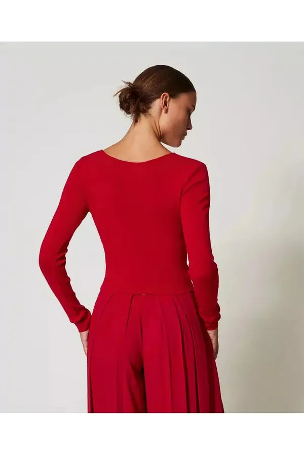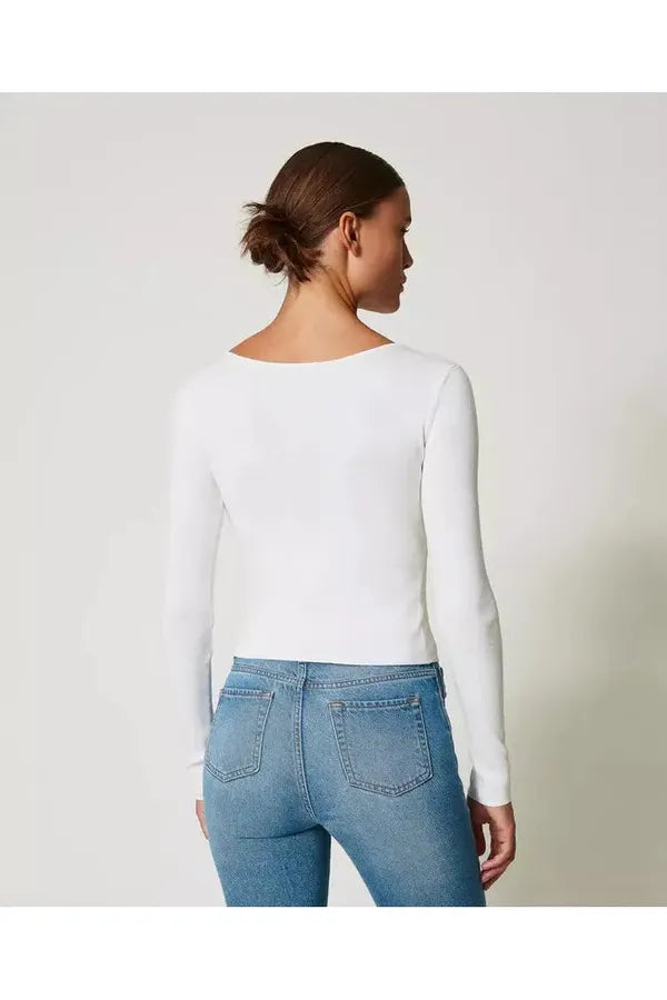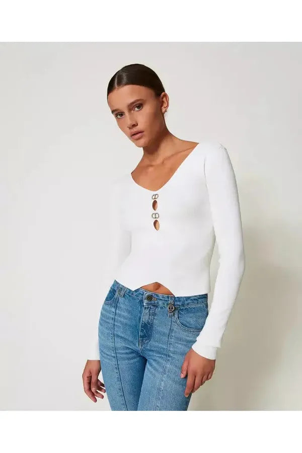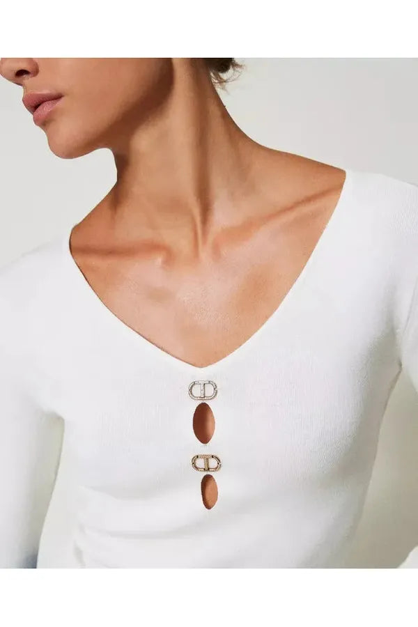 Jersey de doble uso (se puede llevar por ambos lados) en mezcla de viscosa elástica con aberturas de lágrima y placas metálicas decorativas Oval T. Tiene cuello de pico, mangas largas, abertura en un lateral en la parte inferior y corte ceñido.