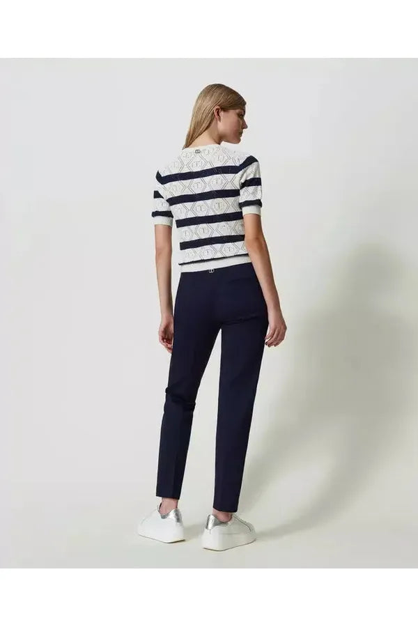 Prenda comodín del armario para interpretar como quieras. Son unos pantalones pitillo confeccionados en mezcla de viscosa elástica de punto Milano con cremallera lateral, bolsillos al bies, raya planchada y placa con logotipo Oval T. Combínalos con la americana a juego para conseguir un traje perfecto para el trabajo y las ocasiones formales.