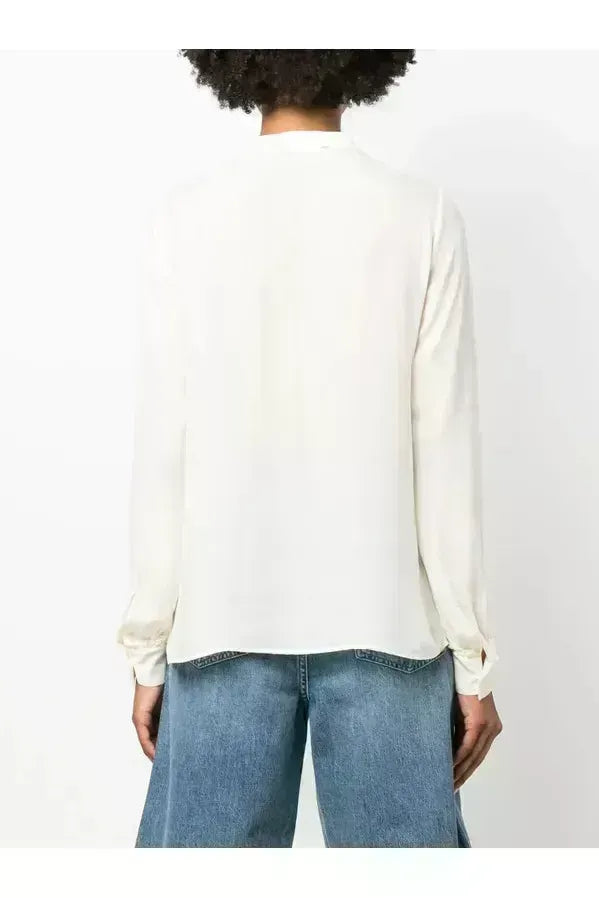 mezcla de seda, ribete con volantes, detalle de pliegues, sin cuello, cierre con botones en la parte delantera, manga larga y dobladillo redondeado.
