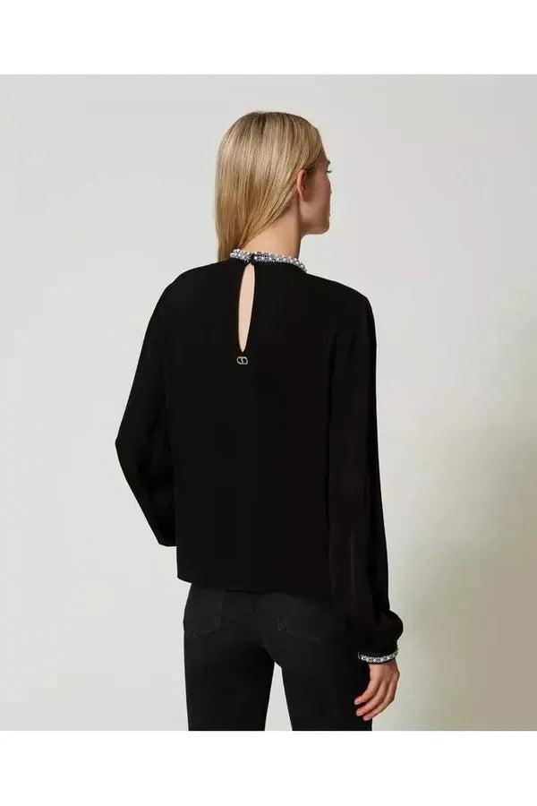 Blusa made in Italy de crepé de viscosa con cuello y puños bordados a mano con cuentas de diseño geométrico. Tiene cuello alto bordado, abertura de pico, mangas largas con puños y botones, abertura de lágrima con botones, sin forro y corte recto. Perfecta para looks de fiestas y ceremonia.