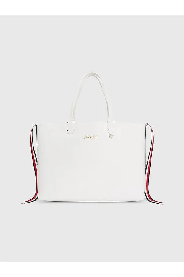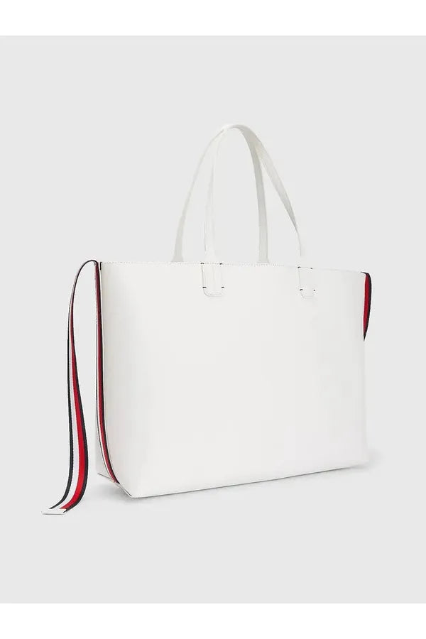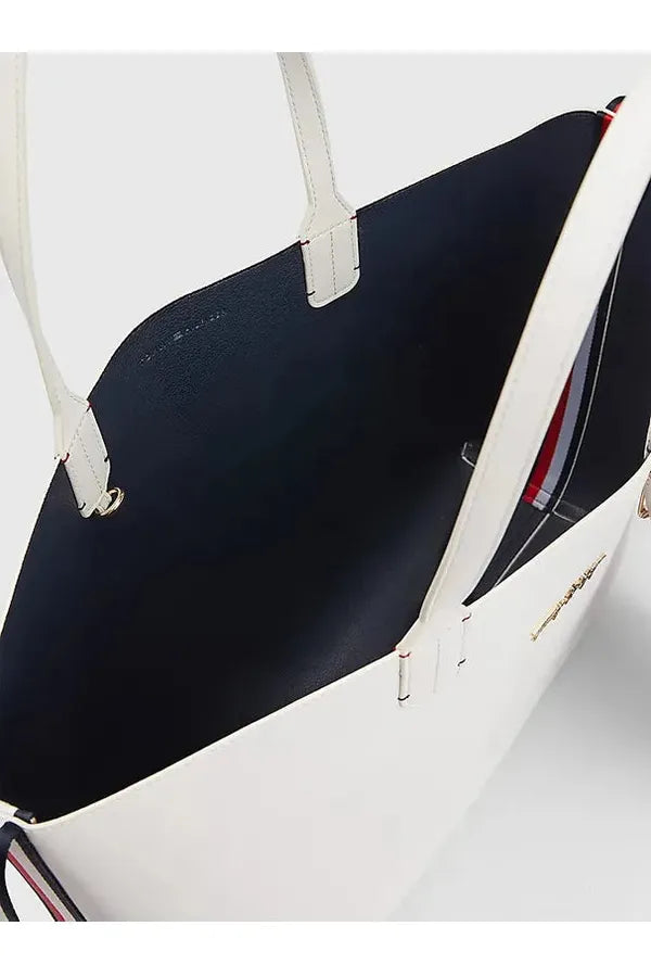 Este espacioso bolso tote de líneas depuradas, decorado con un logo metálico con la firma de Tommy Hilfiger, tiene capacidad para todas tus pertenencias e incluye un monedero extraíble.
