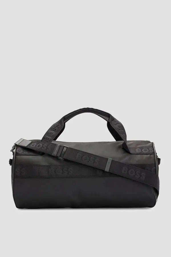 Una bolsa de viaje con todo el carácter BOSS, elaborada en sarga deportiva con monograma doble metalizado, asas con detalle de la marca y correa desmontable para el hombro. Medidas: 28,5 × 55 × 28,5 cm