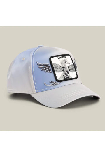 Pegaso en pleno vuelo, rompiendo fronteras con alas que no conocen fronteras. Un desvanecimiento plateado, costuras contrastantes y un parche que no puede contener la leyenda. Elevación, cosida.