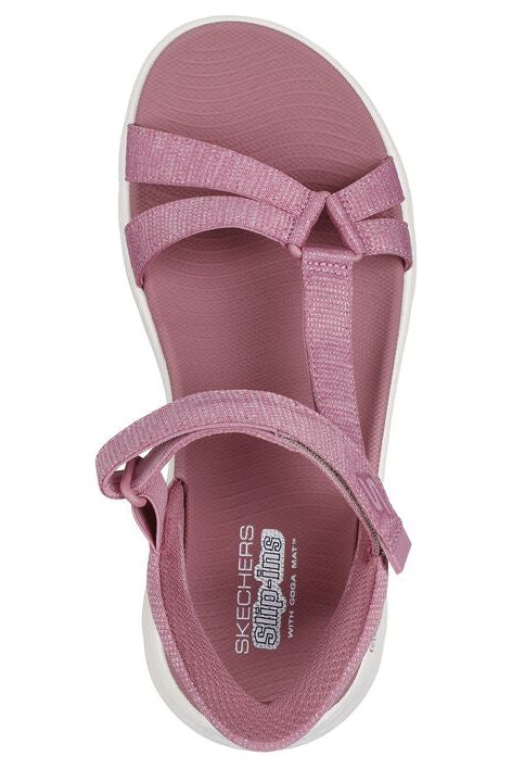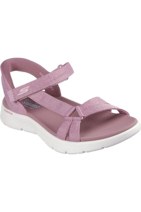 Combina fácilmente tus nuevas sandalias deportivas preferidas Skechers Hands Free Slip-ins®: GO WALK® Flex Sandal - Illuminate. Diseñada con nuestro sistema exclusivo Heel Pillow™, esta sandalia deportiva de tiras cuenta con una parte superior de malla con correa ajustable en el empeine, una plantilla moldeada Goga Mat®, la amortiguación ligera ULTRA GO® y una pieza trasera en el talón.