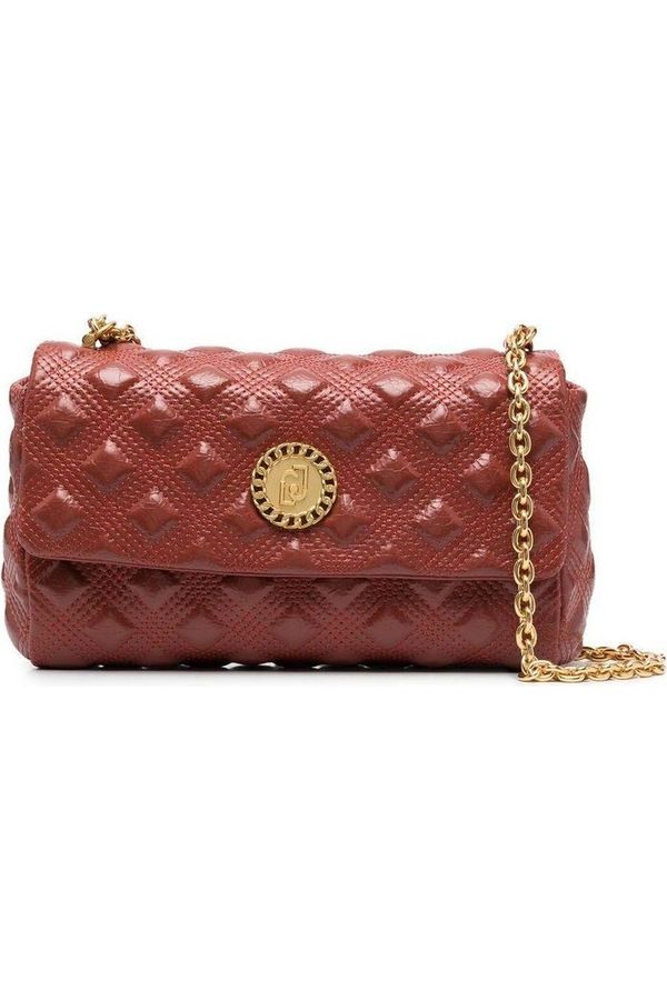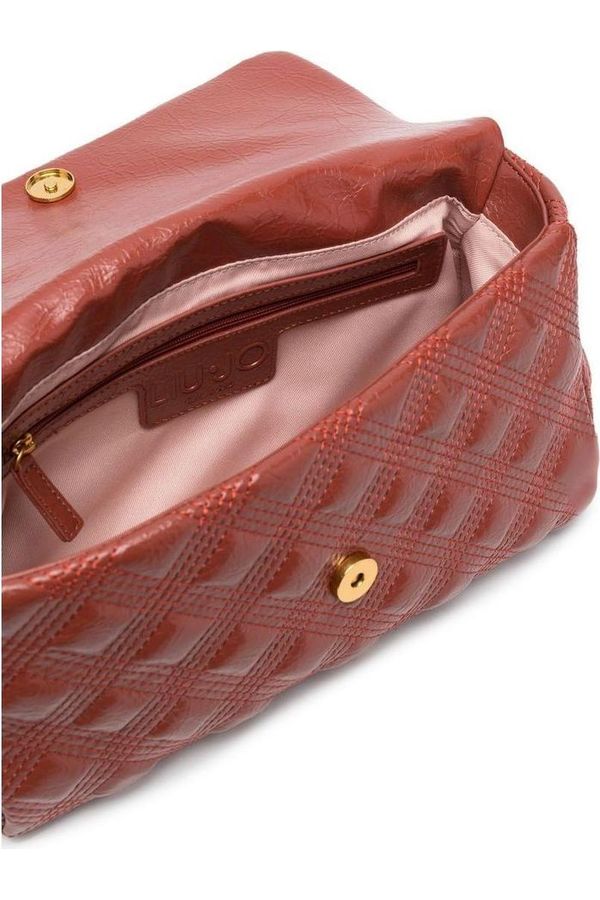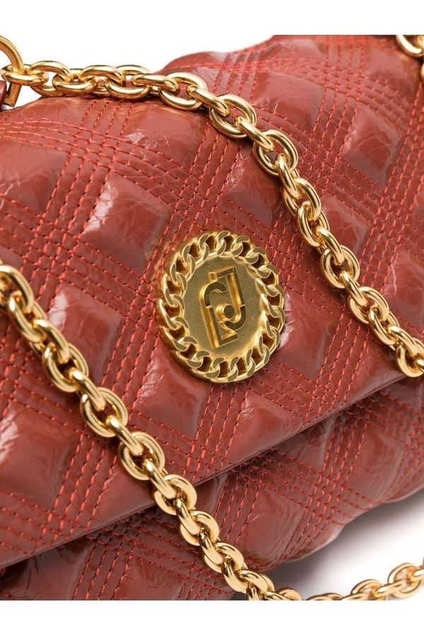Negro carbón, capitonado, acabado en tono dorado, parte superior plegable, bolsillo interno con cierre y correa de cadena para el hombro.