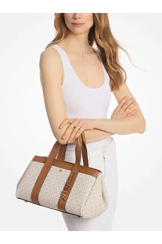 El glamour contemporáneo cobra protagonismo con el bolso satchel Romee. Se ha fabricado en lona con nuestro exclusivo estampado de logotipos y se realza con ribetes de piel y un sofisticado adorno MK. Las resistentes asas superiores tienen el tamaño perfecto para llevarlo cómodamente colgado del hombro, mientras que la tira de bandolera te permite tener las manos libres sin renunciar al estilo.