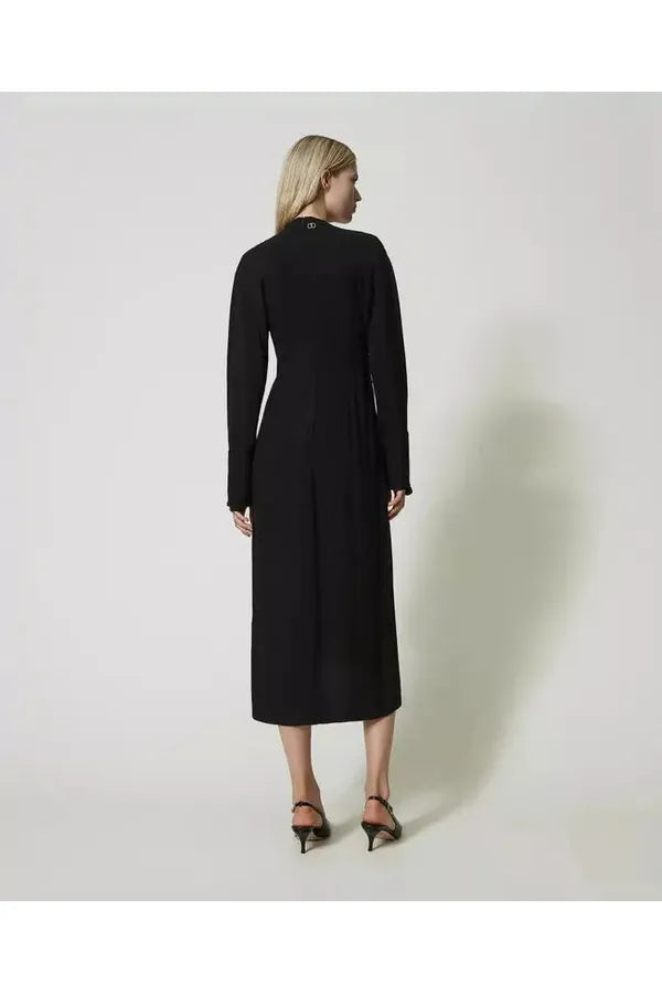 Vestido largo de crepé georgette de viscosa con botones metálicos con logo Oval T calado y ojales volantes en los puños. Cuello redondo con abertura de pico en la parte delantera, mangas largas tipo kimono, corte en la cintura, abertura en el centro delantero, cierre con cremallera en el lateral, sin forro y es de corte holgado.